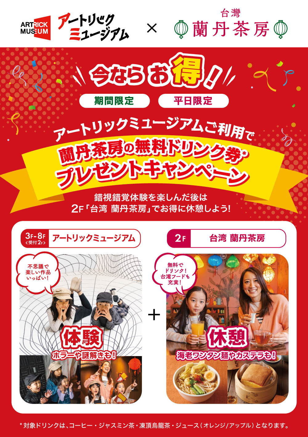 ご入館者様限定で、2F「台湾 蘭丹茶房」の無料ドリンク券をプレゼント!