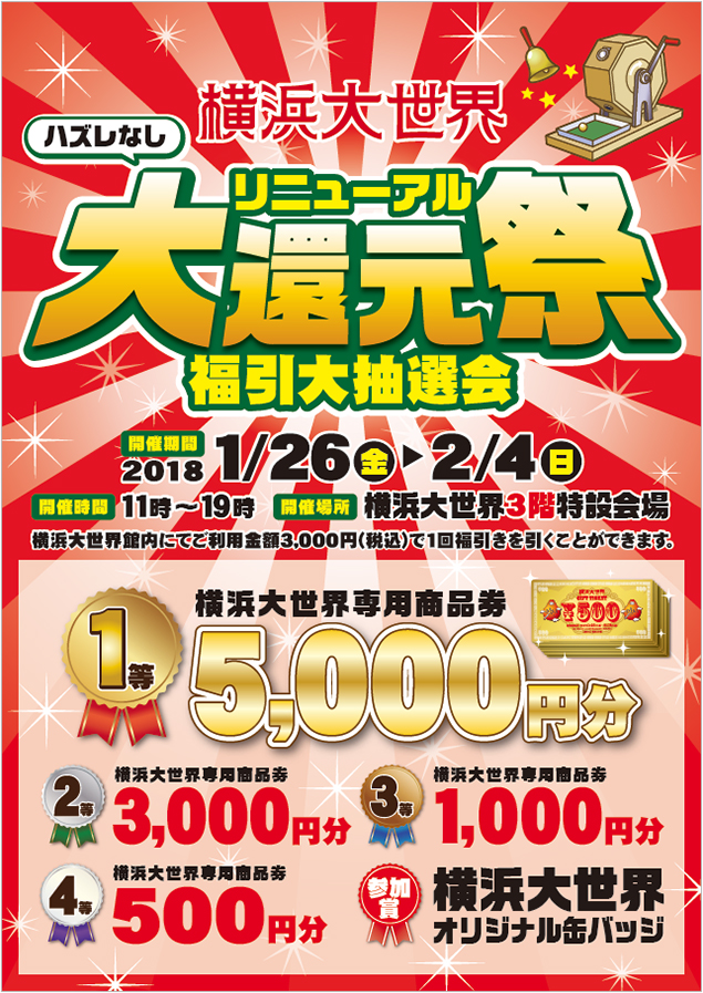 横浜大世界のリニューアルに伴い、皆様の日頃のご愛顧に感謝致しまして、全館あげて『横浜大世界リニューアル大還元祭 福引大抽選会』を開催致します。皆様お誘いあわせの上、是非お越し下さい。